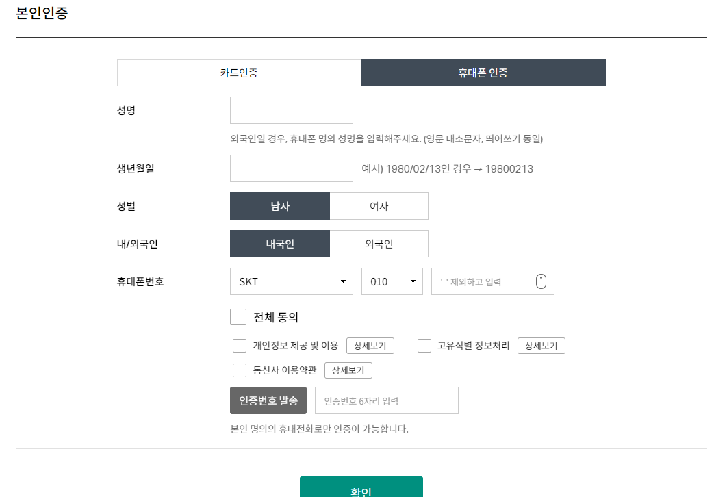 본인인증은 카드인증 혹은 휴대폰인증을 통해 진행해주시면 됩니다.